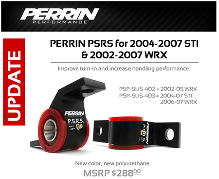 Perrin has updated their line of Positive Steering Response System (PSRS) bushings for several Subaru models. The precision urethane lower control arm bushings improve steering responsiveness in corners and refines straight-line tracking.
